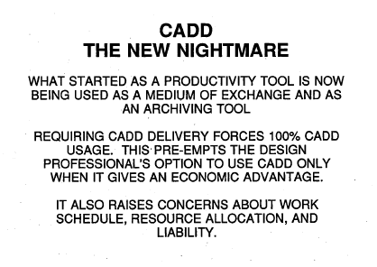 I was looking for something completely different, when in the company archives, I found a hard copy of a presentation by John F. Hill from HNTB given on August 6th 1992 titled "CADD Risk Management: The New Nightmare".